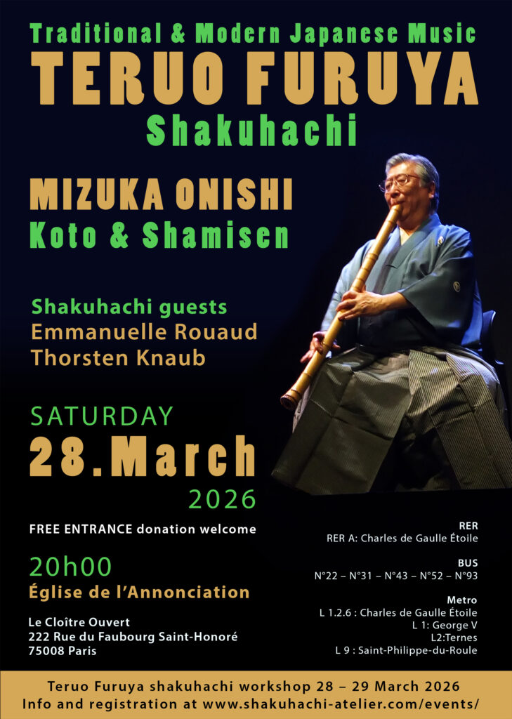 We are excited to announce our 2020 Masterclass with Teruo FURUYA (shakuhachi), director and principal instructor of the Kokusai Shakuhachi Kenshūkan (KSK) in Japan and Mizuka ONISHI (koto/shamisen), recipient of the Tottori Prefecture Cultural Achievement Award 2020, in Saint-Maurice (Paris). The dates are the weekend of the 7 & 8 March and for the location we will return to the Academy of Music and Theater of Saint Maurice.